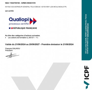 Cette certification, délivrée par un organisme accrédité, garantit que nos actions de formation respectent un niveau élevé d'exigence et de qualité. Elle atteste que notre processus de formation est conforme au Référentiel National Qualité (RNQ) défini par l’État français.