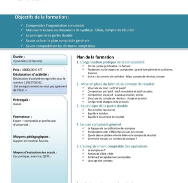 Ce module inclut également des exemples concrets, des cas pratiques corrigés, et un accompagnement en petit groupe pour favoriser les échanges. Vous repartirez avec les bases nécessaires pour lire un bilan, comprendre un compte de résultat et assurer la tenue simple mais rigoureuse de la comptabilité de votre activité.